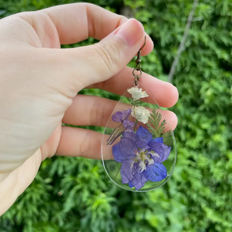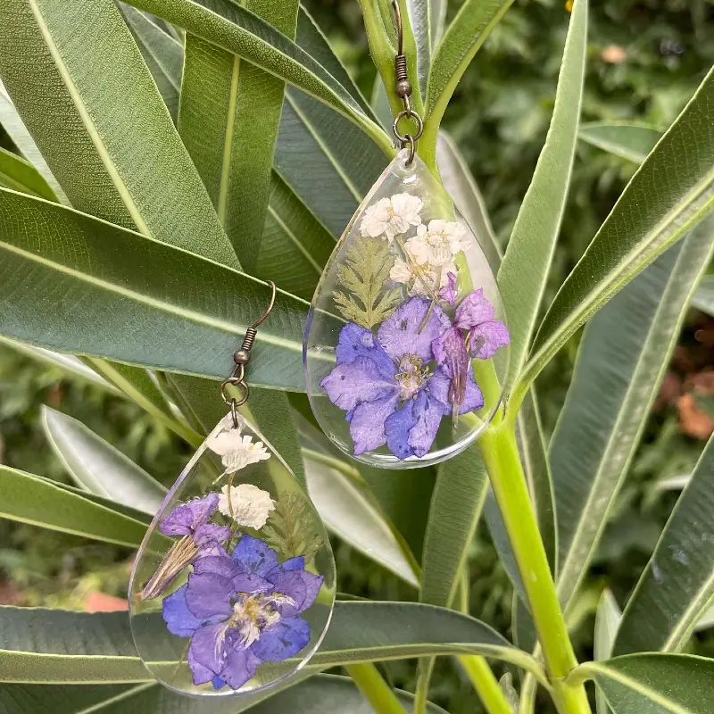 Piezas de resina transparente con flores naturales secas en tonos violetas y hojitas verdes.